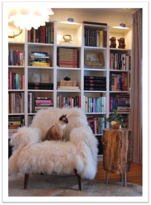 Simply beautiful upholstery! I love the formality of this area with the buit-in bookshelves, lovely chandelier, and striking table!